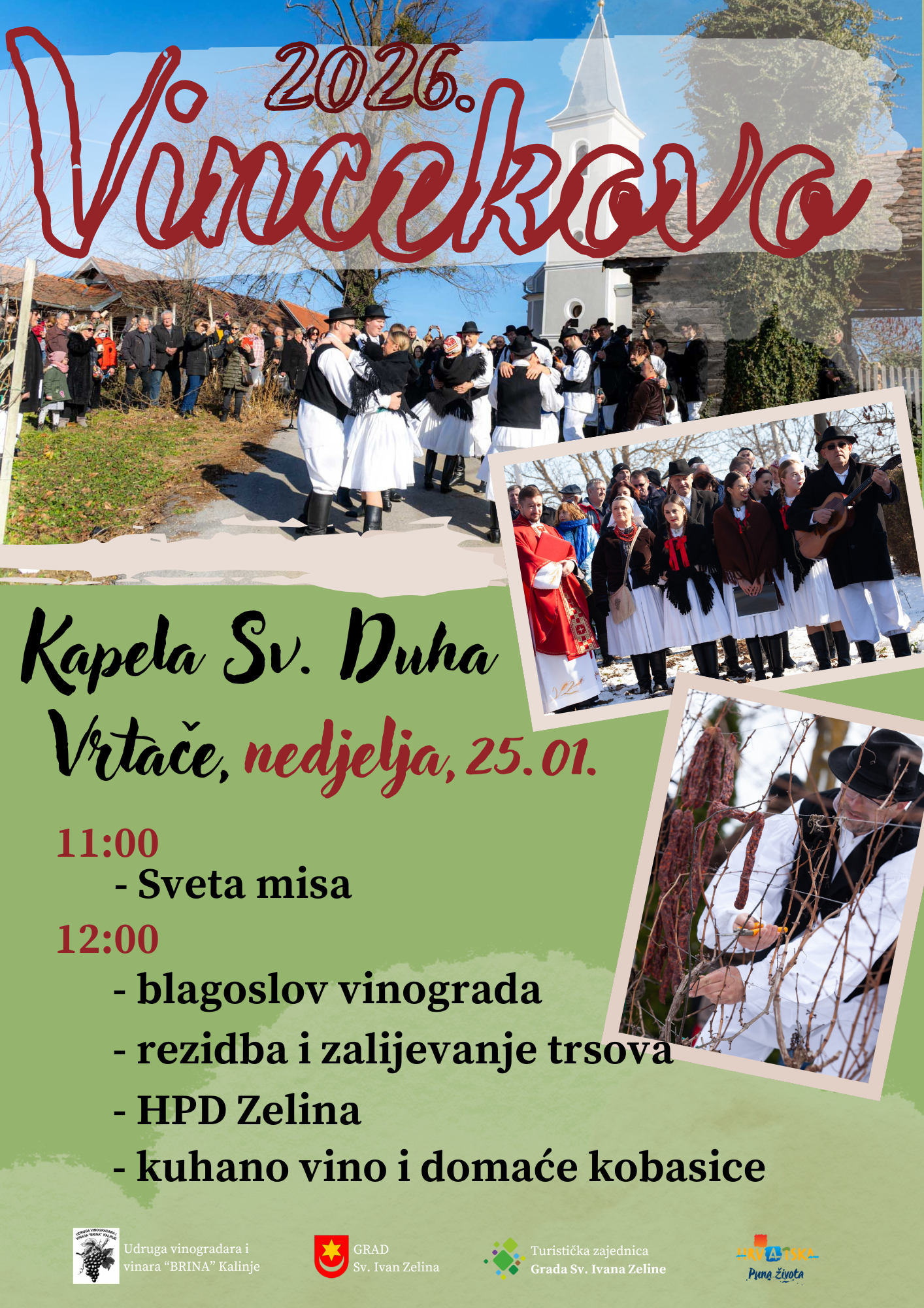 Domaćini ovogodišnjeg obilježavanja Vincekova, Udruga vinara i vinogradara Brina iz Kalinja, uz suorganizatore Grad Sveti Ivan Zelina i Turističku zajednicu grada Svetog Ivana Zeline, poručuju: „Dođite, uživajte u čarima vinogradarske tradicije i započnite novu godinu u dobrom društvu!“